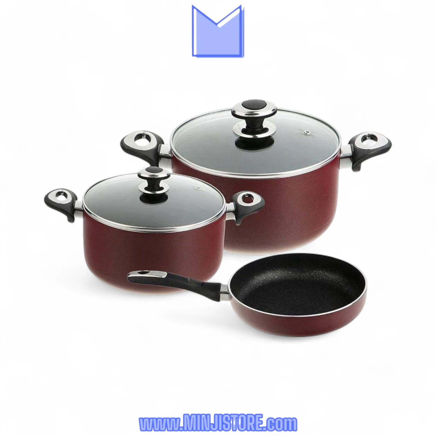 سرویس قابلمه 5 پارچه گرانیتا زرساب با طراحی ساده و کاربردی، شامل سه قابلمه در سایزهای مختلف به همراه دربهای شیشهای مقاوم و یک تابه تکدسته است.